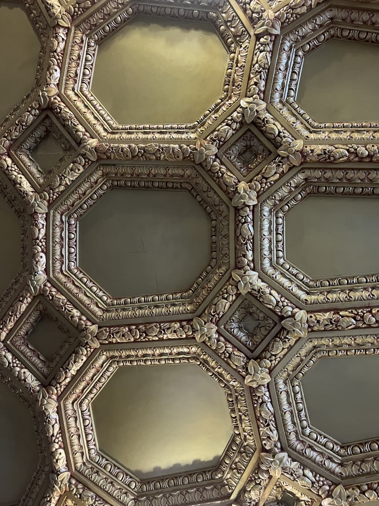 The coffered ceiling of the Garfield Park Fieldhouse, with octagonal and diamond-shaped panels framed by intricate plasterwork. Each border is alive with carved vines, fruit, and flowers—an exuberant touch of Spanish Baroque Revival design. The geometry provides order, while the ornament celebrates abundance, turning the very ceiling into a work of art above the community space. | MIKE ROMAIN