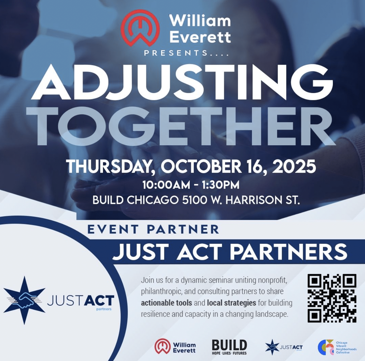 BUILD Chicago will host this seminar with Just Act Partners, William Everett and Chicago Vibrant Neighborhoods Collective, uniting partners to share tools and strategies for nonprofits in this new era. Join us at our Austin campus on October 16 for a half-day of learning, dialogue and collaboration. Learn more: https://events.eventnoire.com/e/adjusting-together