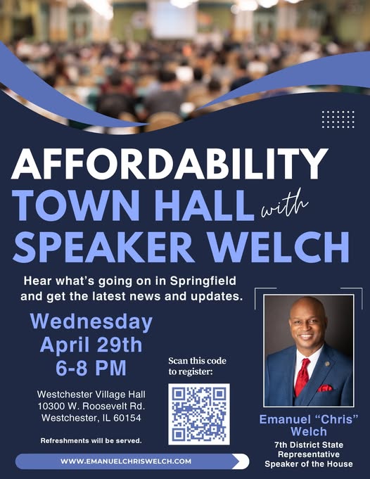 On April 29th, 6-8 PM at Westchester Village Hall (10300 W Roosevelt Rd.) I will be hosting an Affordability Town Hall to keep you in the loop about what I’m getting done in Springfield this legislative session. I look forward to seeing you there.