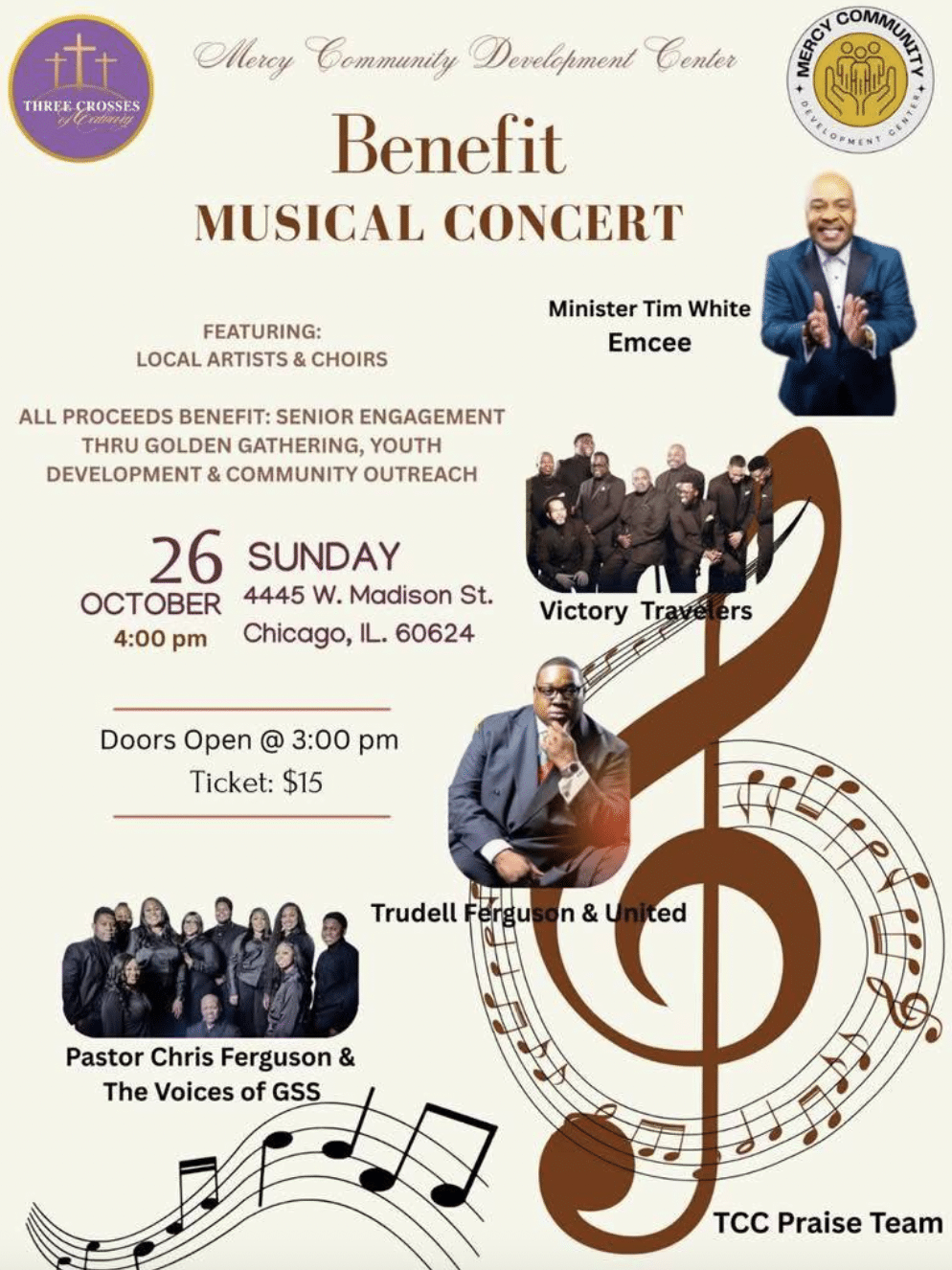 Featuring local artists and choirs, including the Victory Travelers, Trudell Ferguson & United, Pastor Chris Ferguson & The Voices of GSS, and the TCC Praise Team. Min. Tim White will emcee. All proceeds benefit senior engagement through Golden Gathering, youth development, and community outreach. Tickets: $15.