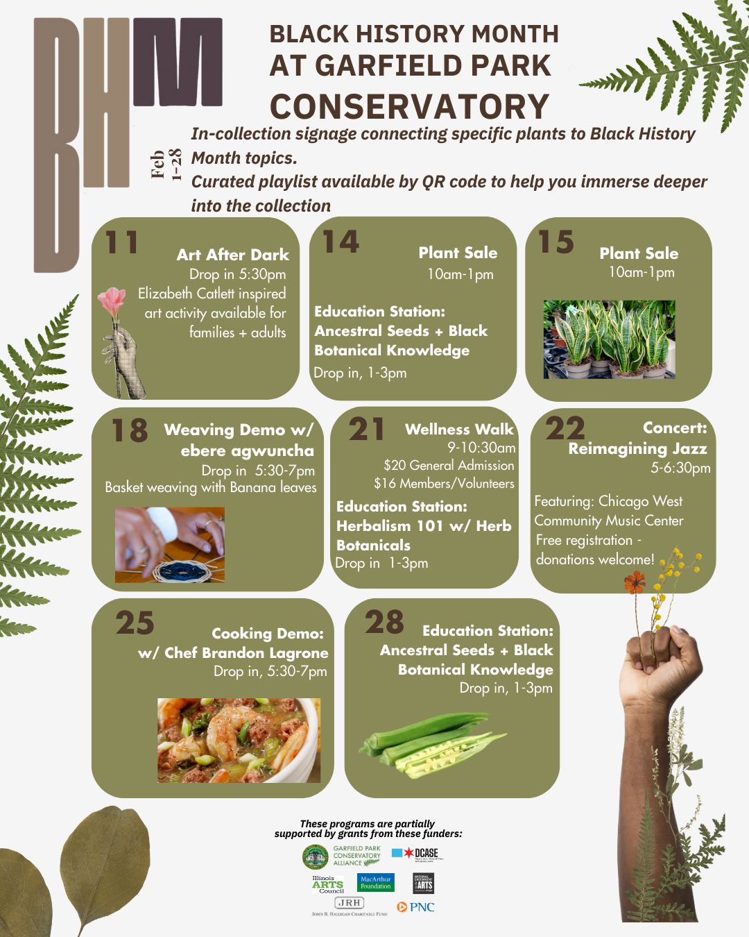 The Garfield Park Conservatory hosts a monthlong series of Black History Month programs connecting plants, culture, and Black botanical knowledge. Events include art activities, plant sales, education stations, wellness walks, weaving and cooking demos, and live music. Select events require registration; many are drop-in. Click here for more info.