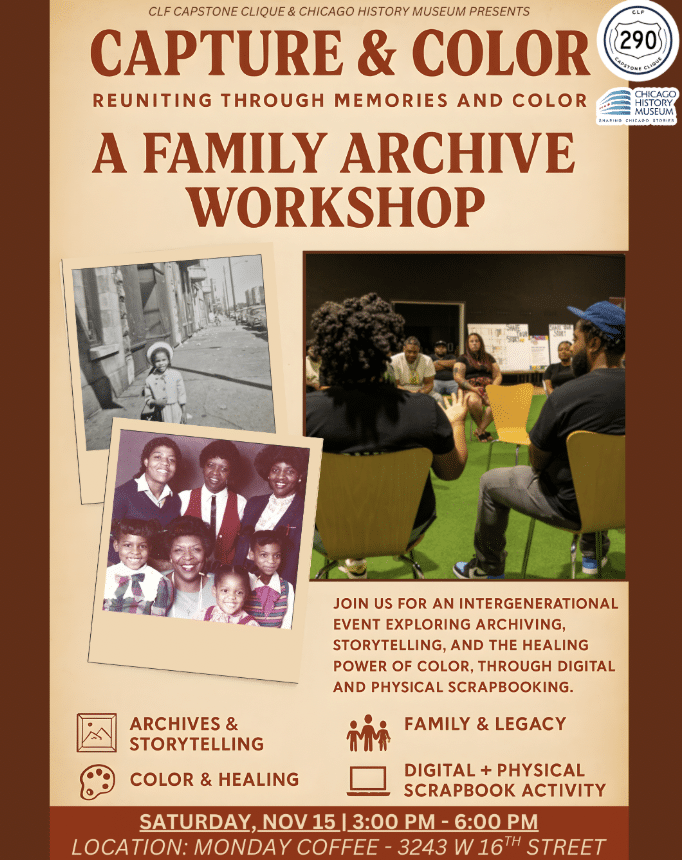 Join the Community Leadership Fellows’ Capstone Clique and Chicago History Museum for an intergenerational workshop celebrating the power of storytelling, archiving, and art to keep our family histories alive.