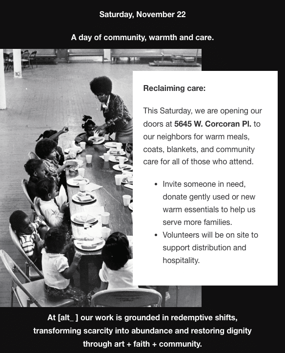 This Saturday, Alt Space Chicago is opening our doors at 5645 W. Corcoran Pl. to our neighbors for warm meals, coats, blankets, and community care for all of those who attend.