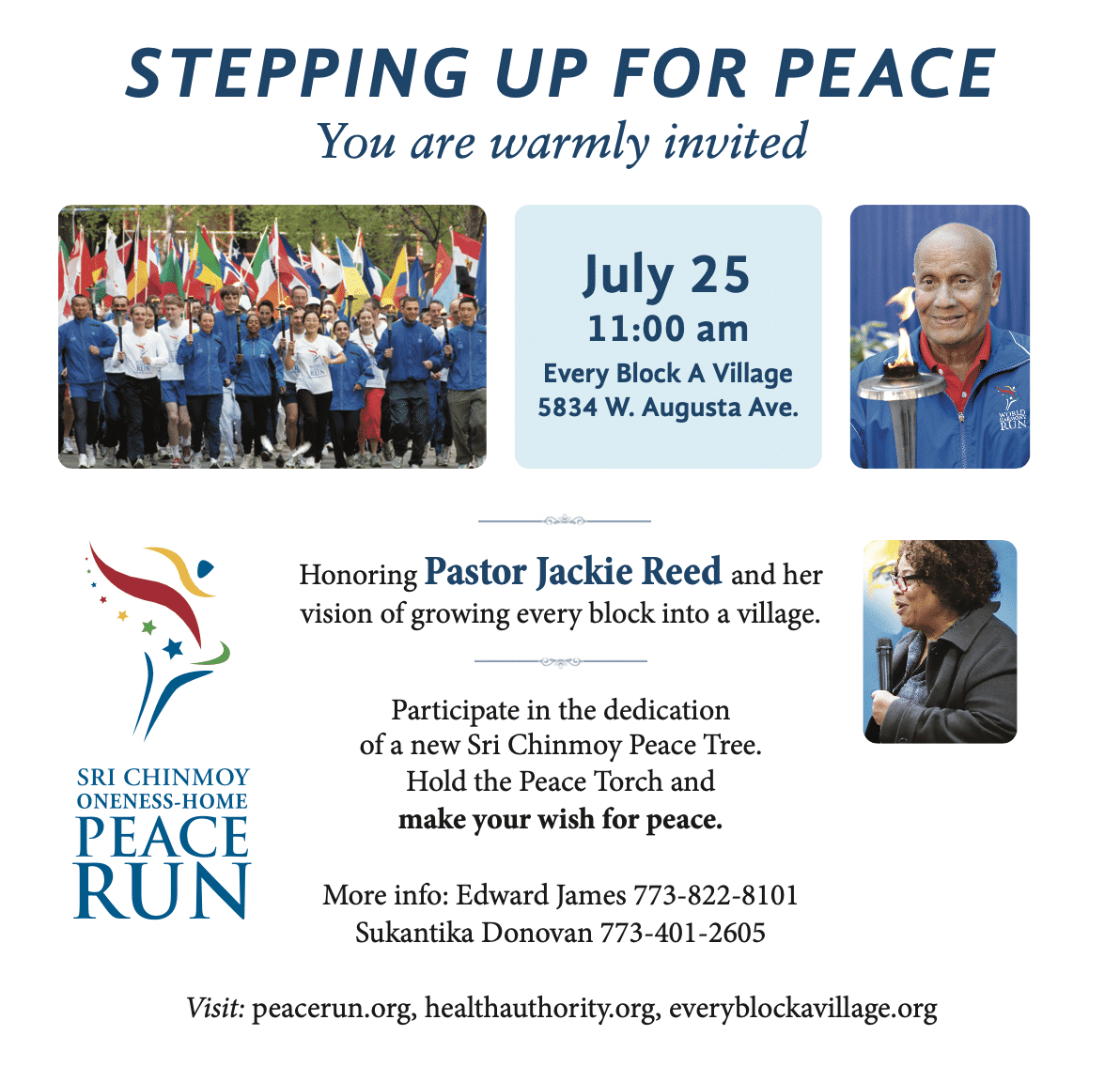 Honoring Pastor Jackie Reed and her vision of growing every block into a village. Participate in the dedication of a new Sri Chinmoy Peace Tree. Hold the Peace Torch and make your wish for peace. For more info, call Edward James (773) 822-8101 or Sukantika Donovan (773) 401-2605.