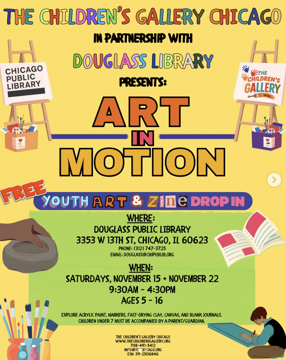 The Children’s Gallery Chicago’s pop-up/studio days program, Art in Motion, is rolling into Douglass Library in North Lawndale for not one but TWO all-day creative takeovers this November! From painting to zine-making to clay, we’re turning the library into a studio of imagination. Youth artwork, with their permission, will be put on display throughout the library!