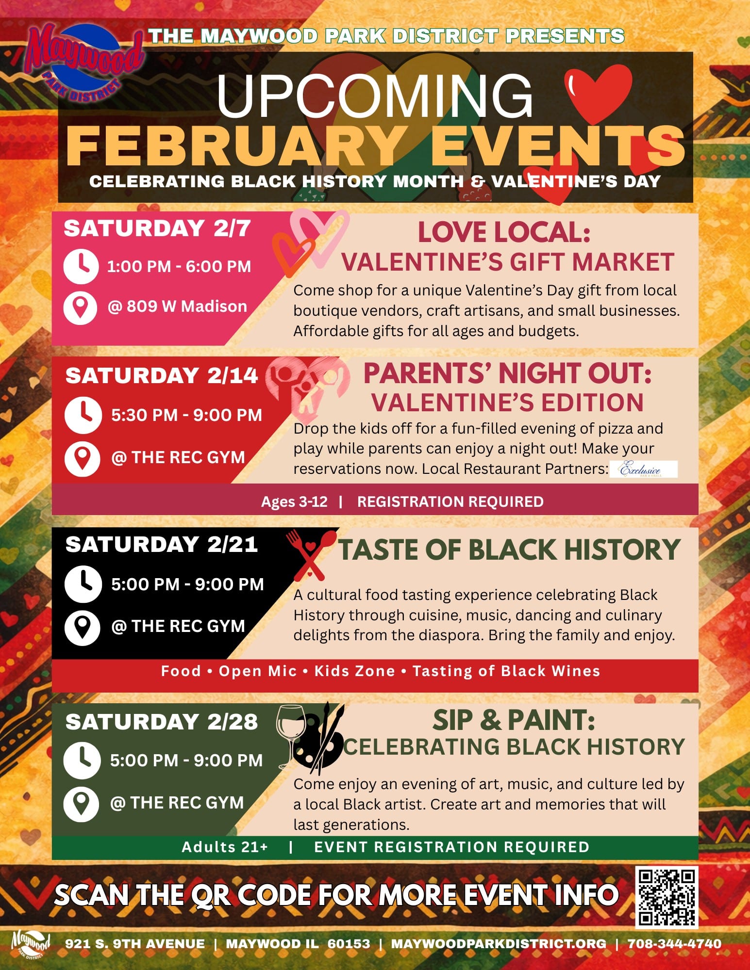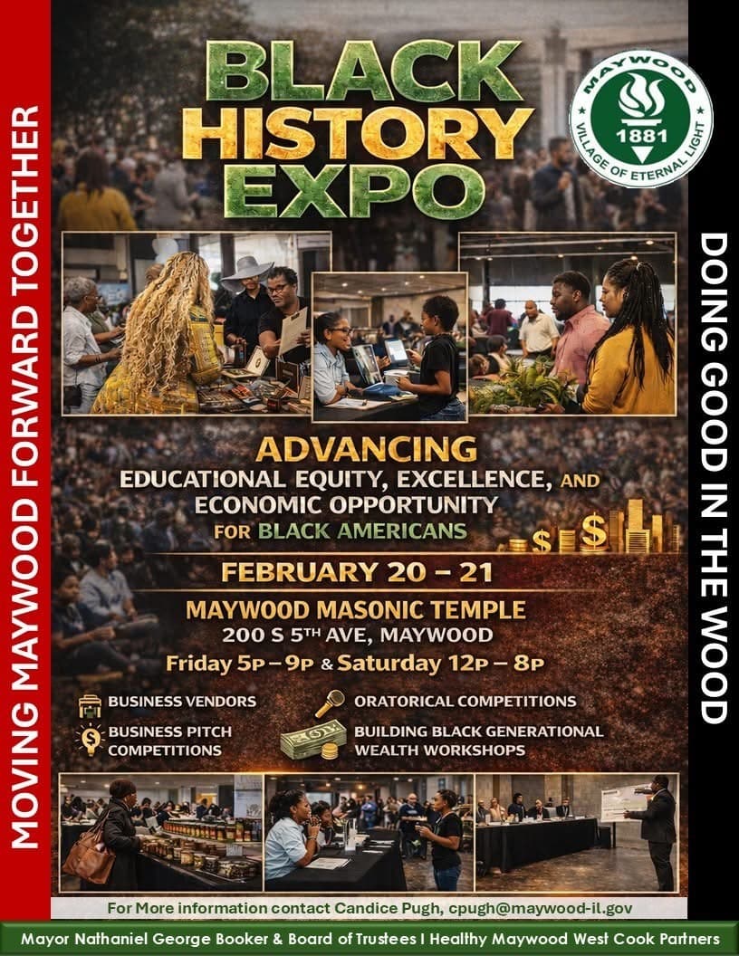 The Maywood Park District will host a Black History Month celebration highlighting the flavors, music, and cultural heritage of the African diaspora, featuring food vendors, music, and community activities. The Sip & Paint event the following week will include art, music, and culture led by a local Black artist. Click here for more info.
