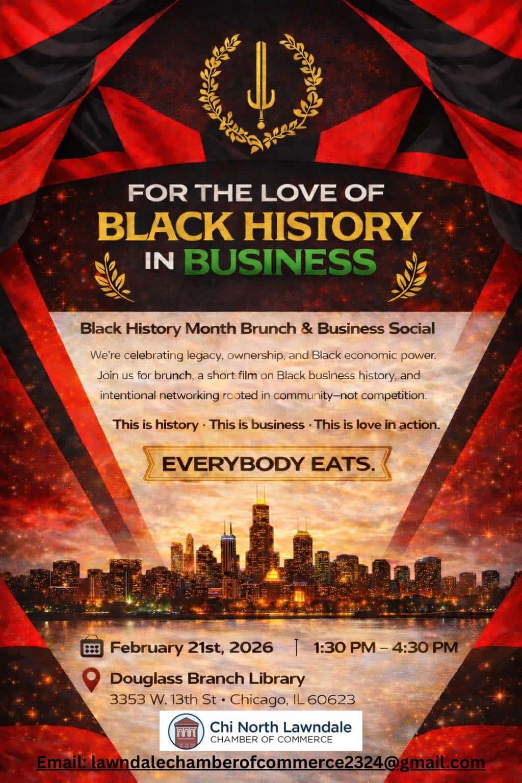A Black History Month brunch and business social celebrating Black legacy, ownership, and economic power. The event includes brunch, a short film on Black business history, and intentional networking rooted in community. Hosted by the Chi North Lawndale Chamber of Commerce. Click here for more info.
