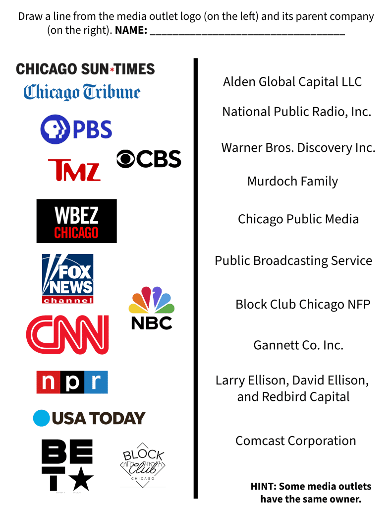 If you’re trying to complete the media ownership worksheet (which you can see below), there’s a handy cheat sheet courtesy of Harper’s Magazine that you can access here. Note, however, that the cheat sheet doesn’t include all of the media outlet owners, so you’ll want to do your own research (try checking a trusted search engine for answers).