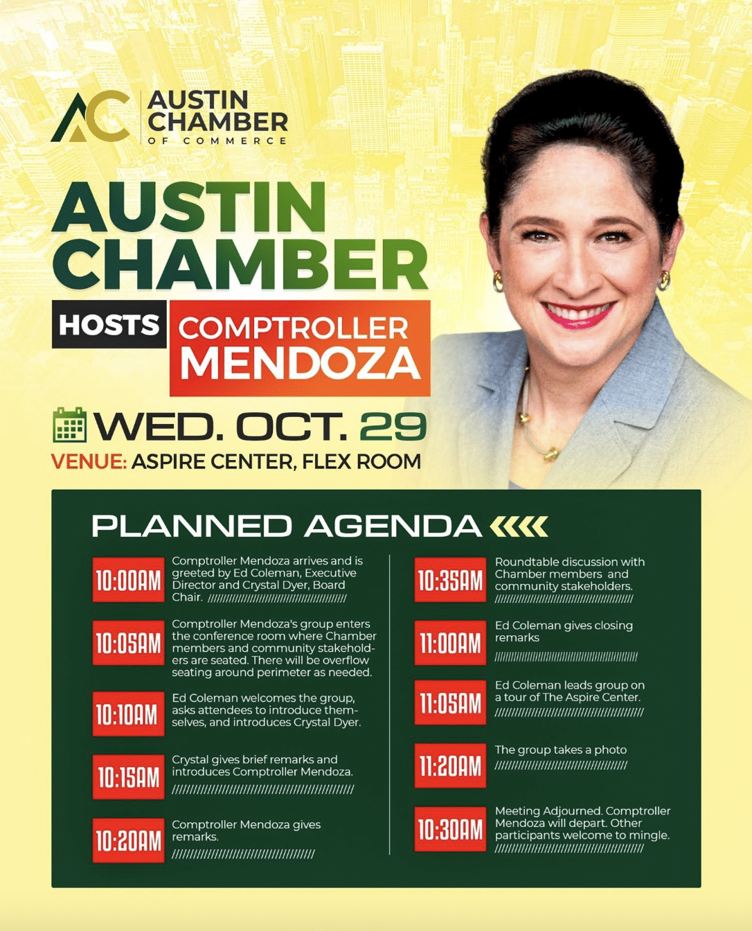 The Austin Chamber of Commerce will host Illinois Comptroller Susana A. Mendoza at the Aspire Center for Workforce Innovation.