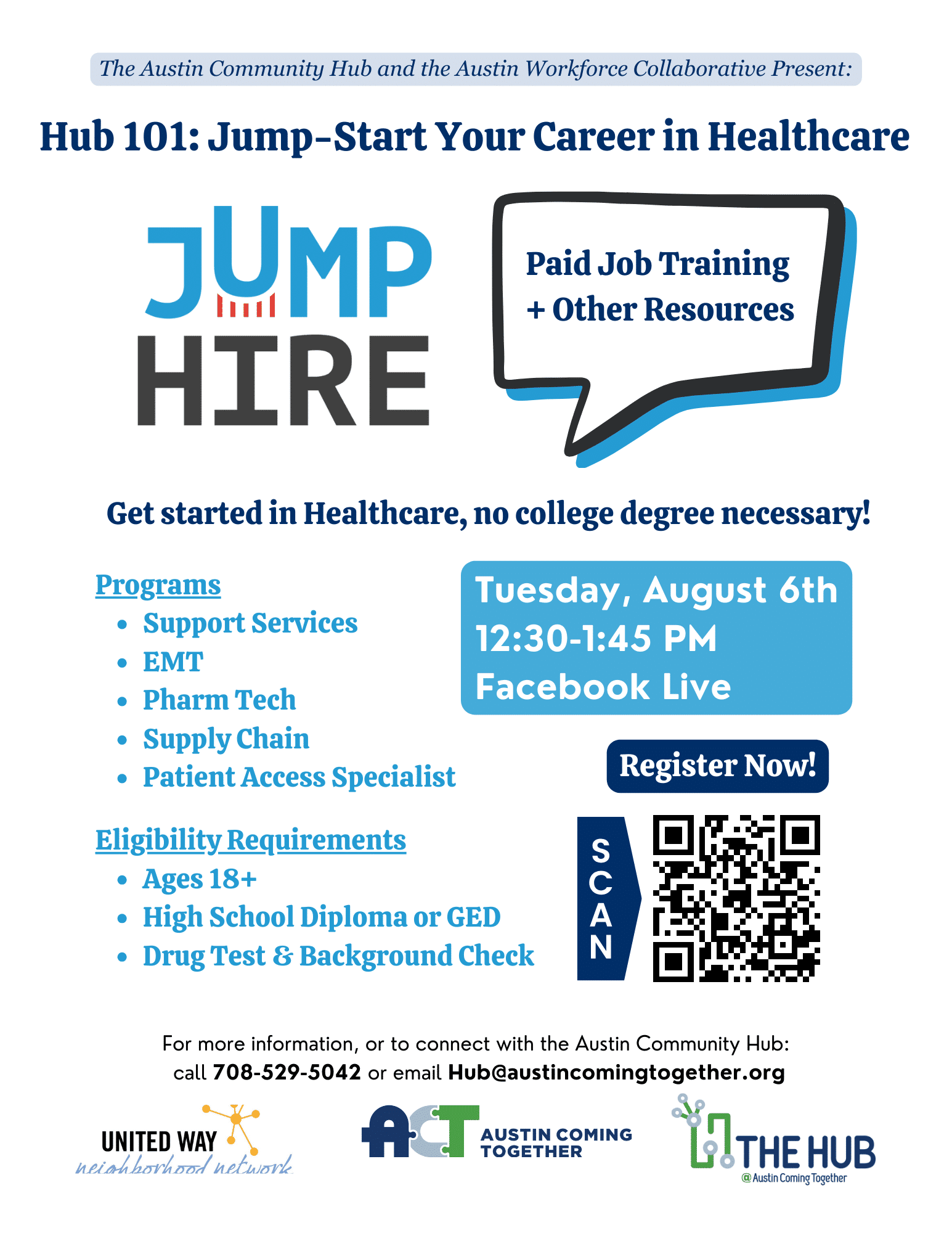 Virtual EventJoin this virtual Hub 101 info session with JumpHire, hosted by ACT's Austin Community Hub! Get details on how they assist job seekers and those interested in the healthcare field through paid training programs, supportive services, and direct connections to employers. Register here: https://shorturl.at/nfwtc.