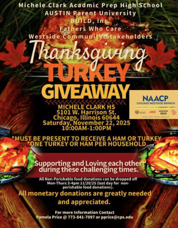 Michele Clark High School 5101 W. Harrison St., Chicago, IllinoisMichele Clark Academic Prep High School, in partnership with Austin Parent University, BUILD, Fathers Who Care, and West Side community stakeholders, is hosting a Thanksgiving Turkey Giveaway to support families during the holiday season. Each household will receive one turkey or ham, while supplies last. Non-perishable food donations are welcome and can be dropped off Mon–Thurs, 3–4 PM through […]