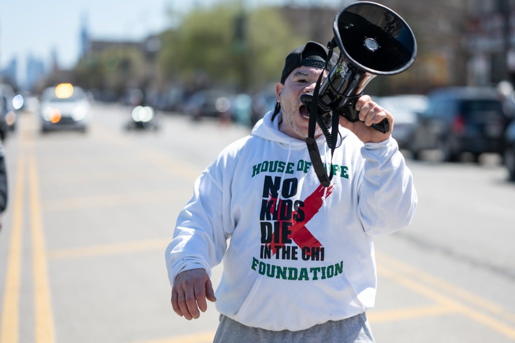 Talei Thompson, a Westside native and founder of the West Side Block Club Association, shouted into a bullhorn during a rally held in a parking lot on Madison and Hamlin on April 13.